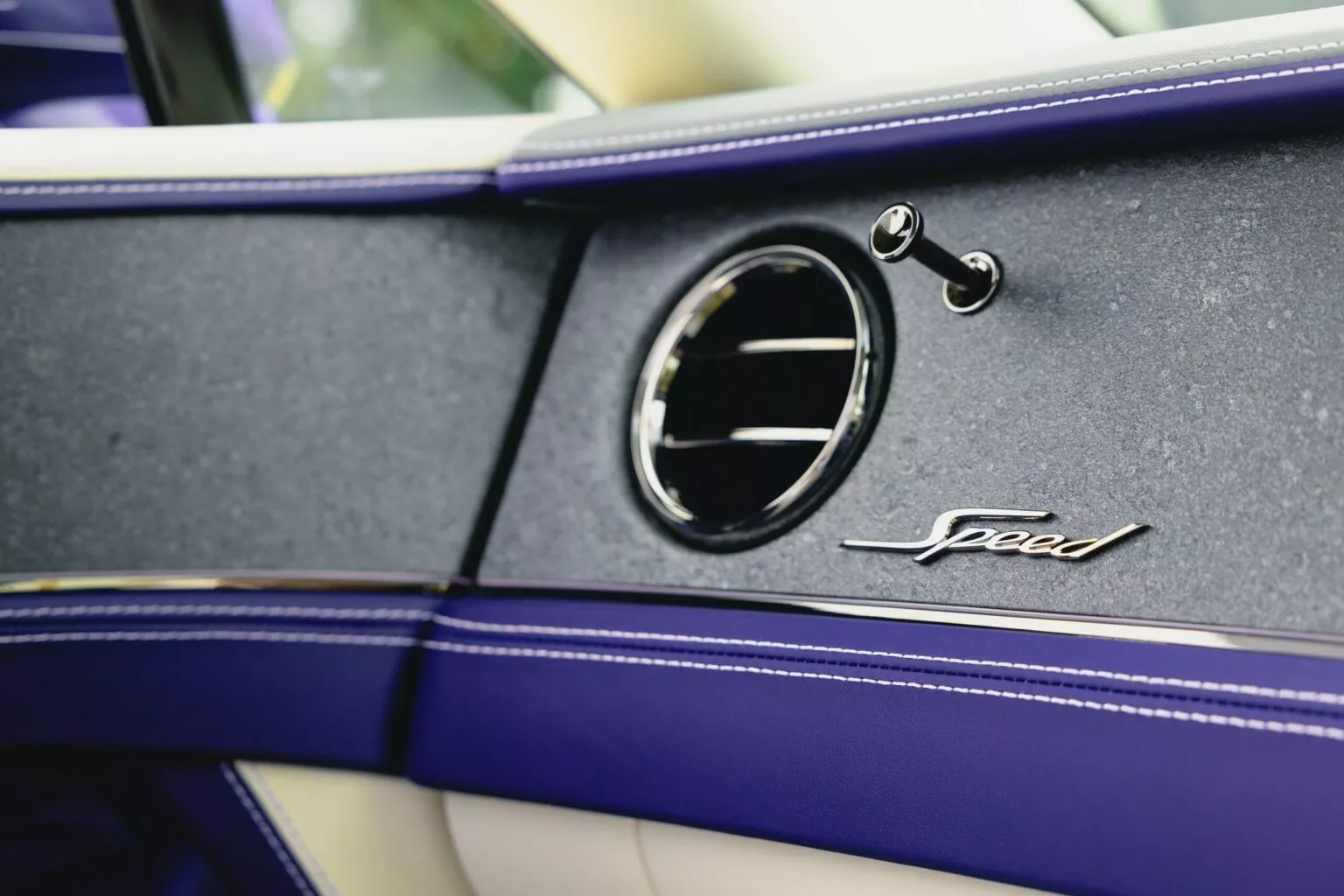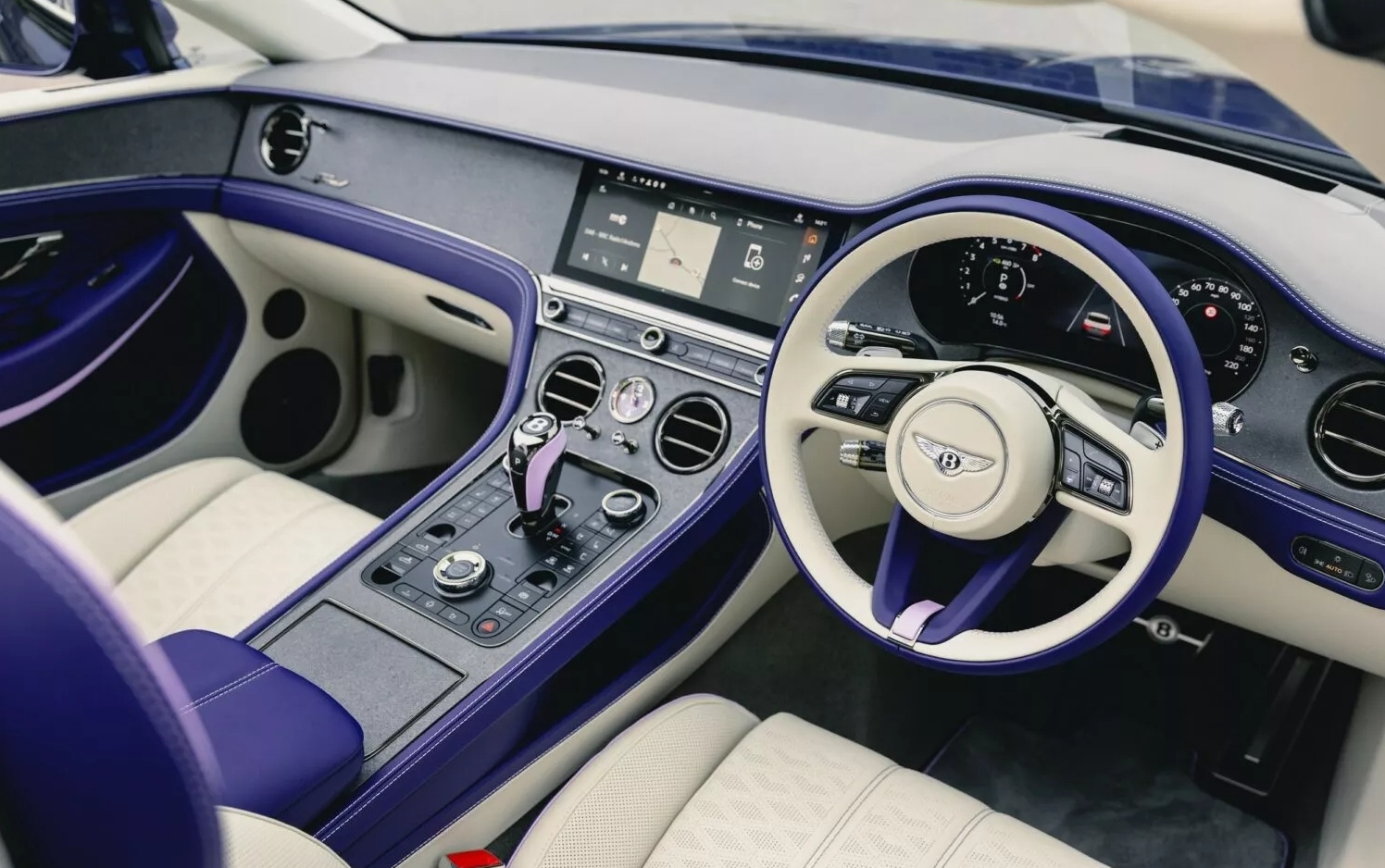 В салоне дверные панели, трансмиссионный тоннель и приборная панель отделаны кожей цвета "Танзанитовый пурпур", а элементы декора - в более светлом сиреневом оттенке. Также есть отделка опциональным каменным шпоном Bentley Stone Veneer из породы возрастом 200 млн лет, толщиной всего 0,1 мм.