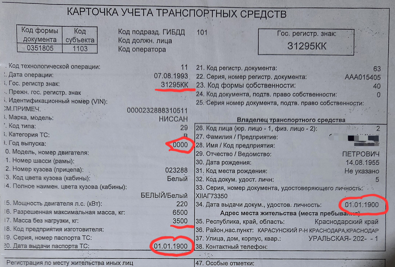Дата регистрации – 1 января 1900 года, а регистрационный номер (31295 КК) не соответствует номеру легкового автомобиля.