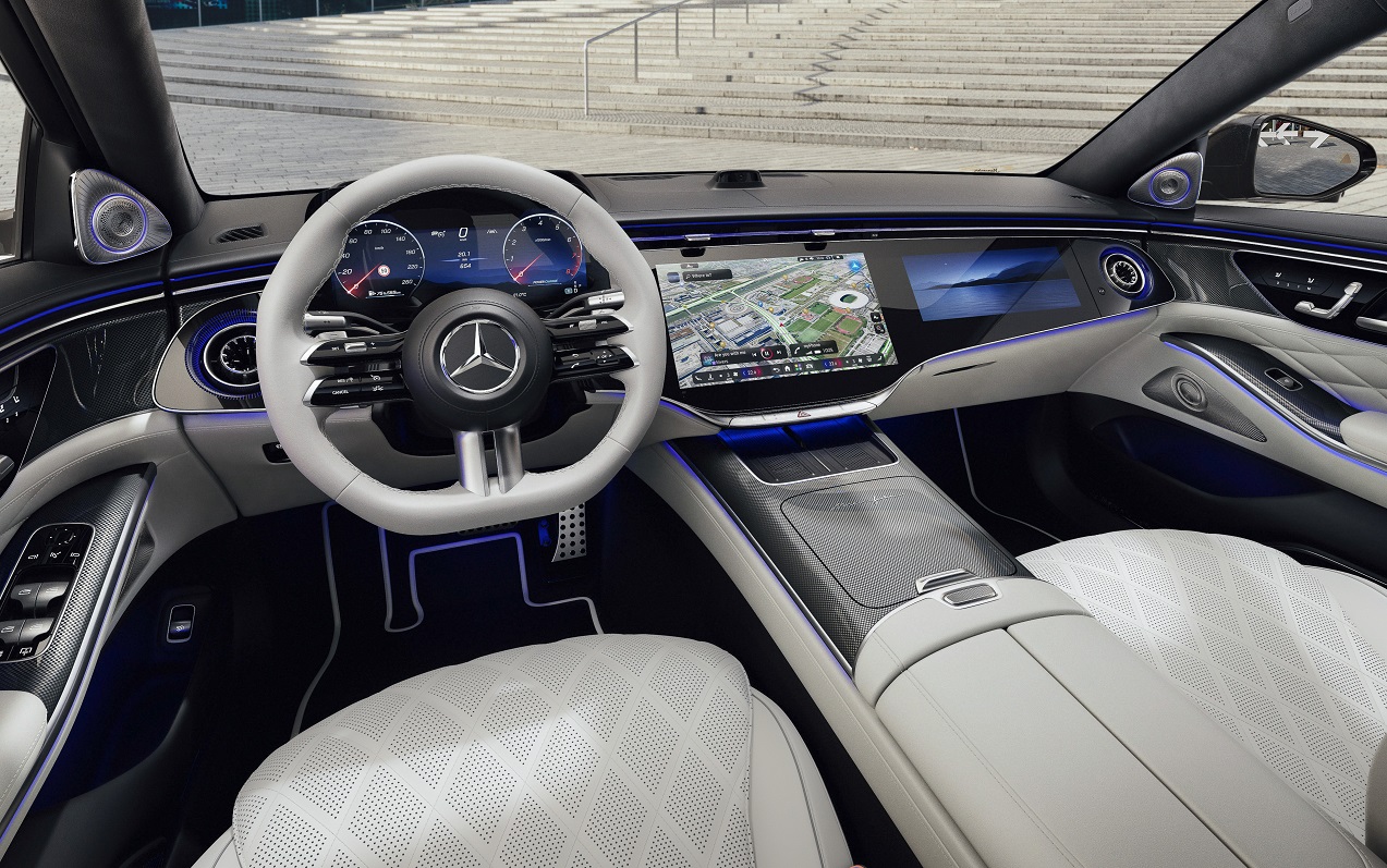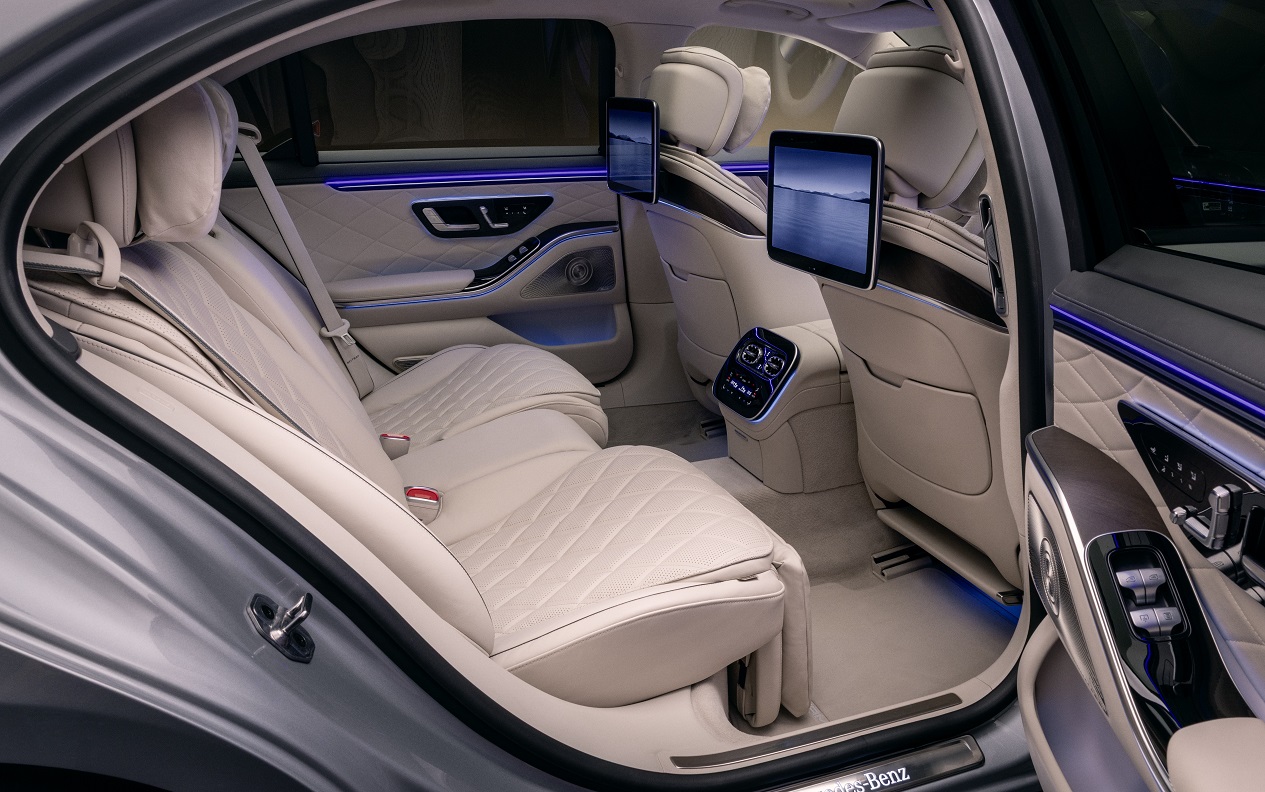 Для задних пассажиров в обновлённом S-Class предусмотрена улучшенная развлекательная система с 13,1-дюймовыми дисплеями. Они оснащены съёмными пультами дистанционного управления, а также камерами, позволяющими проводить совещания в Microsoft Teams.