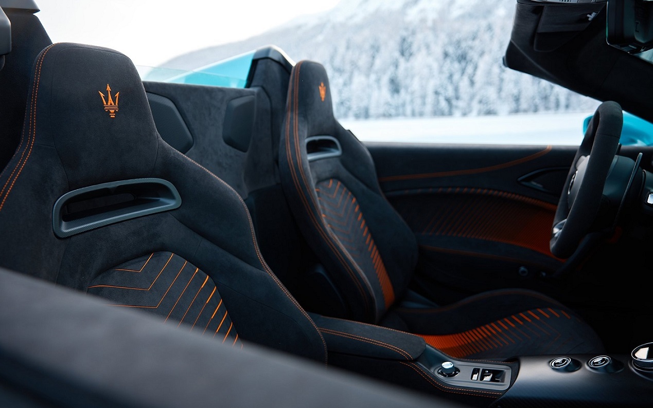 Салон отделан чёрной алькантарой с лазерной гравировкой в виде шеврона, присутствуют оранжевая контрастная строчка, стильные дверные панели и вышитые логотипы в виде трезубца на подголовниках. Плюс отделка из карбона и специальная эмблема с надписью "Maserati Fuoriserie - The ICE 2026 - One Of One".