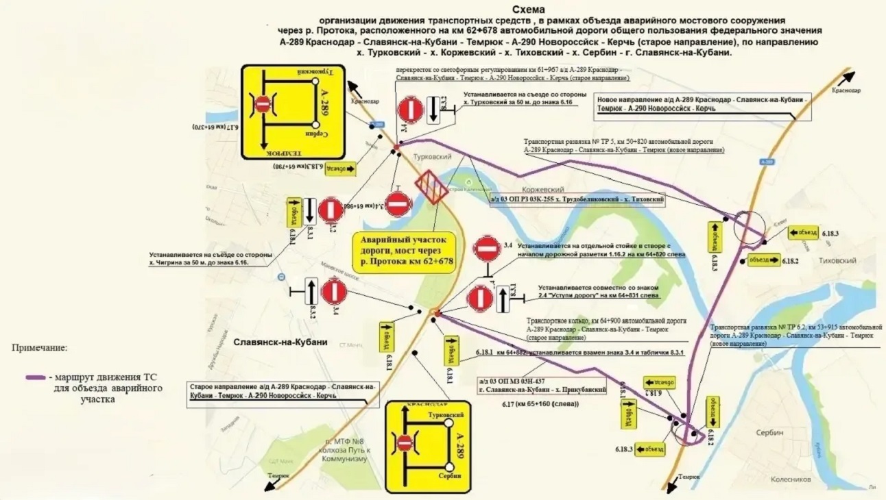 В Славянском районе Кубани закрыли движение транспорта по мосту через реку Протока, который расположен на 63 км дороги А-289 "Краснодар - Славянск-на-Кубани - Темрюк" (старое направление).